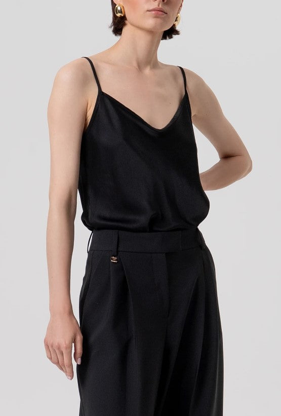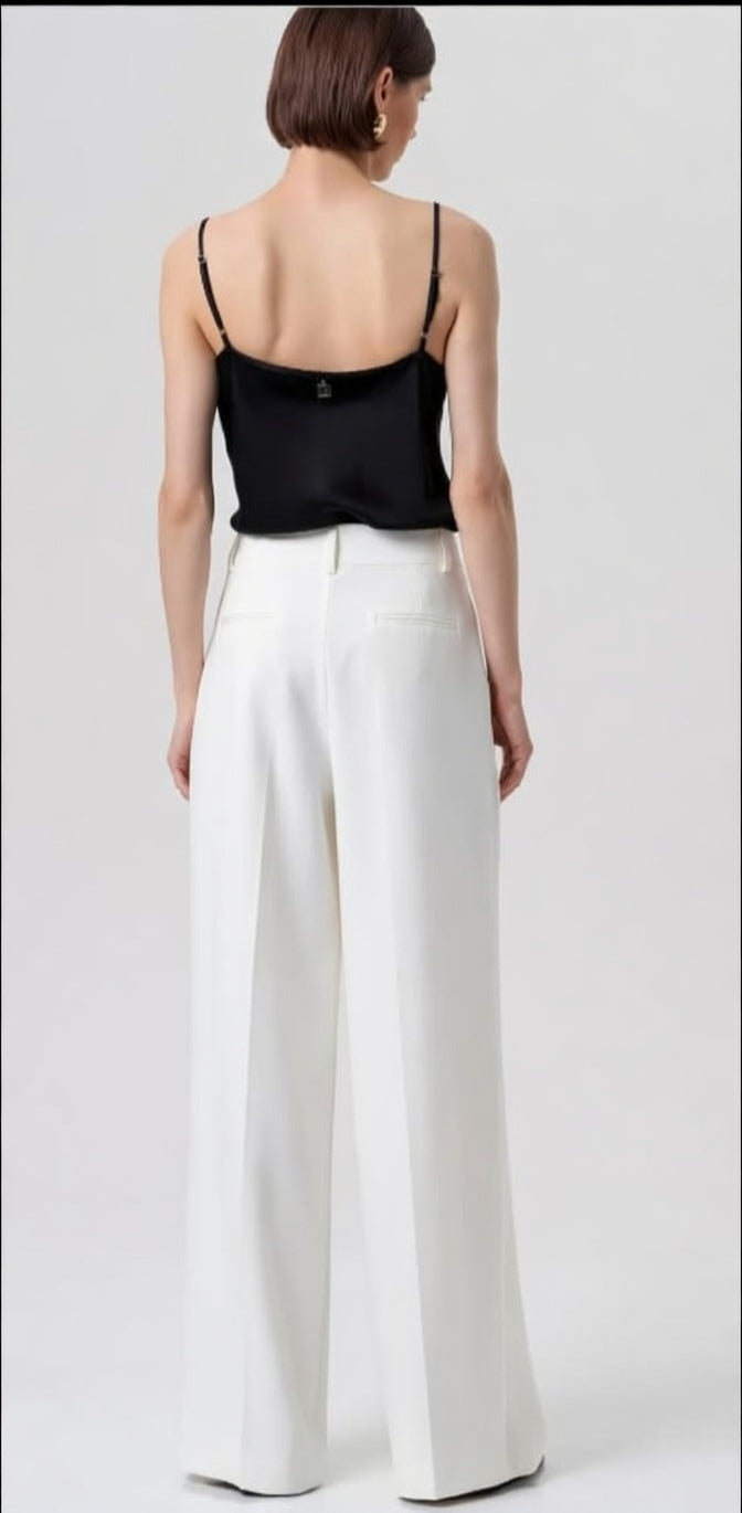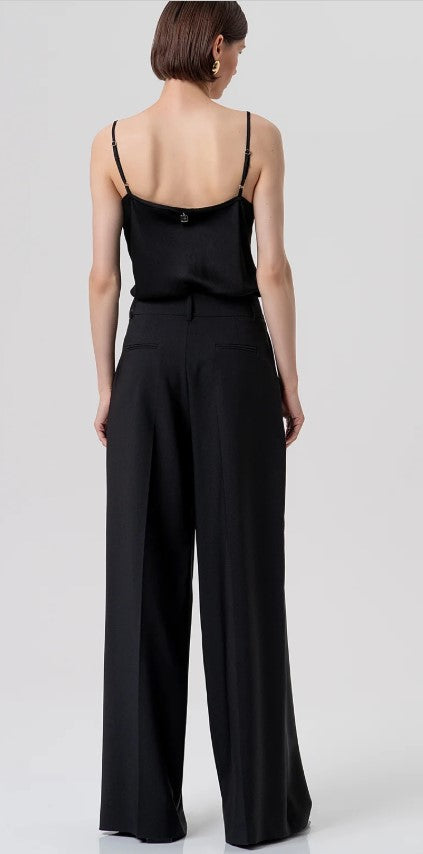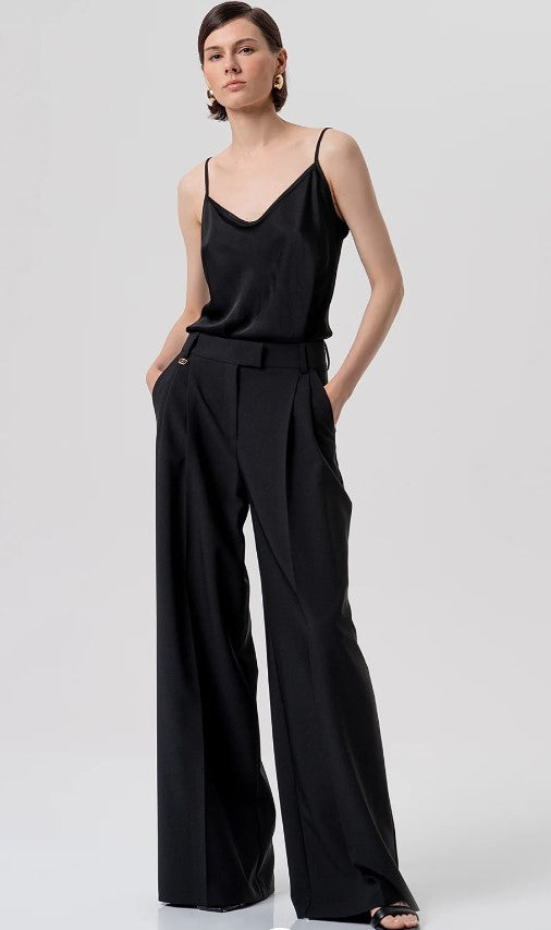 Calça de alfaiataria de cintura alta e pernas largas R26SV3001W42901. Estas calças personificam a elegância sofisticada e o conforto moderno, perfeitas para criar um visual marcante e alongar a silhueta. O tecido é liso e estruturado, ideal para manter a prega central que percorre verticalmente a frente e as costas de cada perna, contribuindo para um visual formal e alongado. O modelo inclui uma ou duas pences na frente, adicionando volume controlado nos quadris.