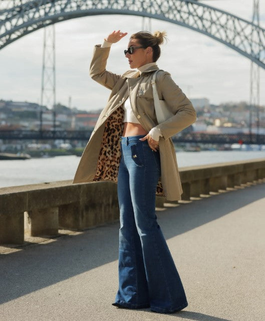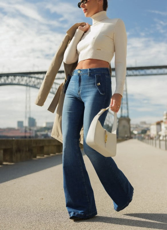 Scripta 245152 jeans, blue high-waisted with bell-cut, diagonal tabs and custom square rivets. The jeans close with a front zipper.