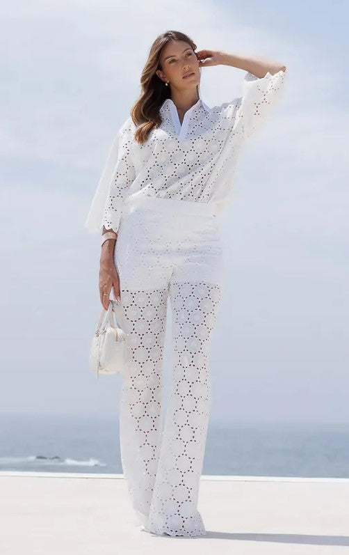 Calça 250156 em tecido de renda com corte boca de sino. Possuí forro. Aperta na lateral com fecho invisível.