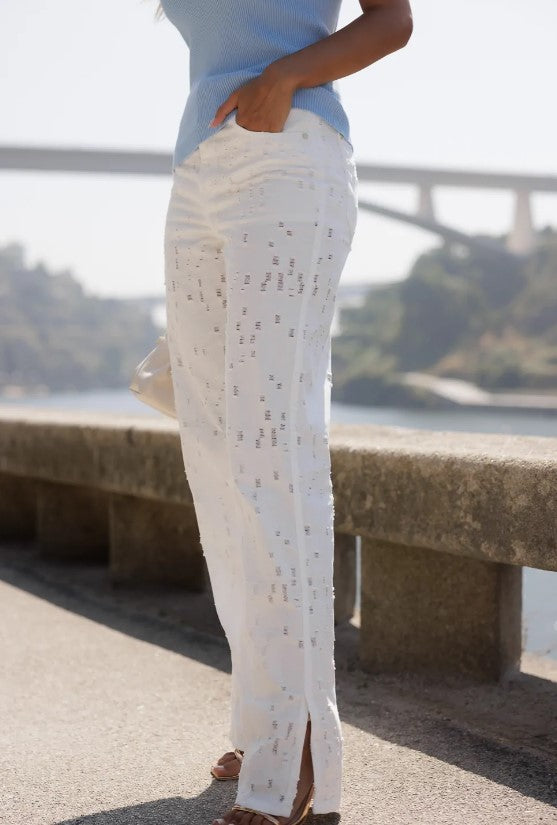 Calça de ganga branca efeito perfurado com cintura subida e perna larga 250217. Detalhe de aberturas no fundo da perneira. Aperta com fecho frontal e botão de prego. O fitting é largo.