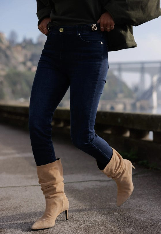 Scripta 245151 high-waisted blue denim trousers with studded buttons and custom rivets. Belt loops with custom applications. Front zip. The trousers have a tight fit.