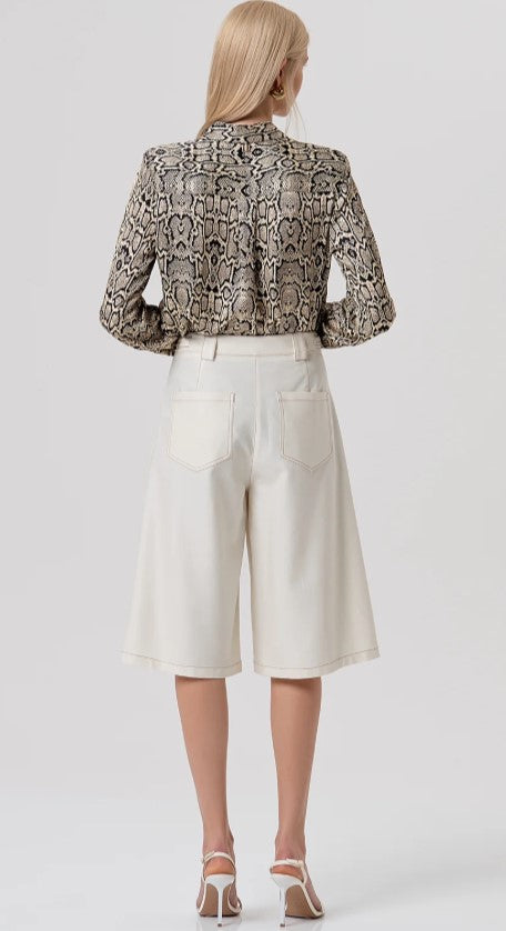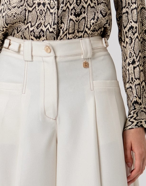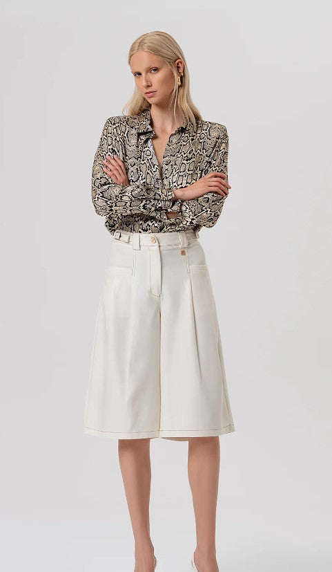 Bermuda flare com pences. Cintura regular com fivelas laterais, bolsos frontais quadrados, bolsos traseiros aplicados e barra larga.
