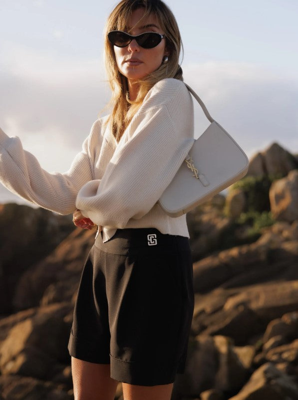 Scripta 245108 high-waisted shorts with belt loops and custom metal applications. Hem detail and invisible side zipper closure.