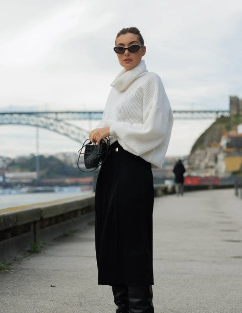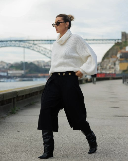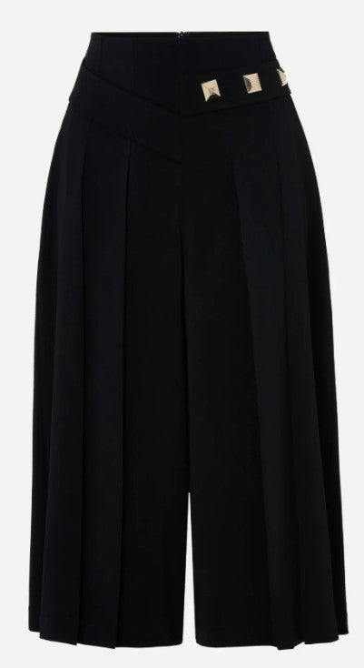 Scripta 245007 shorts, midi length, high waist and fluid cut. Front pleats and insert with personalized metal applications. Fastens on the side with an invisible zipper.