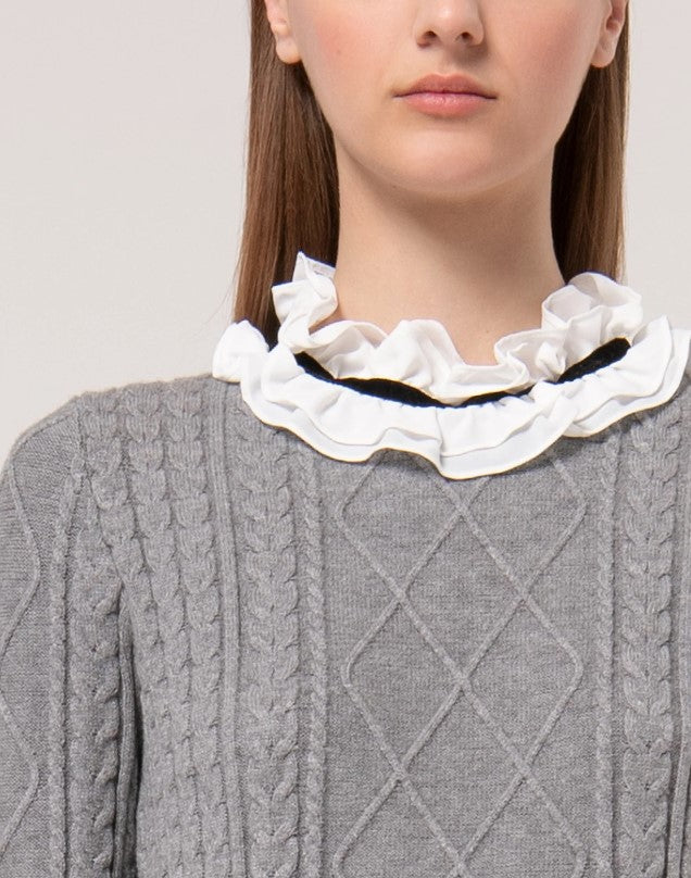 Fracomina FR24WT7034K50401 regular-cut sweater with braids. Round neck with ruffles, teardrop-shaped opening at the back and long sleeves.