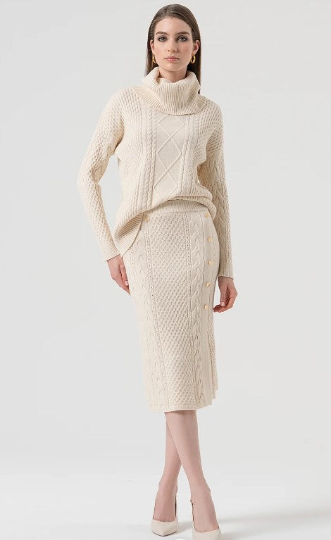 Malha com corte solto e tranças R25WT7035K50201. Gola alta e mangas compridas.