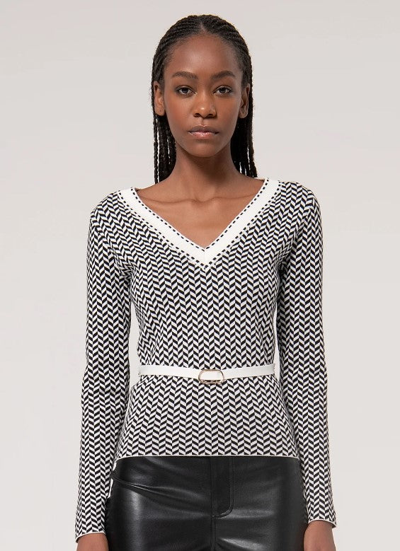 Fracomina FR24WT7020K421F8 sweater, slim fit with geometric jacquard effect. V-neck, belt at the waist and long sleeves.