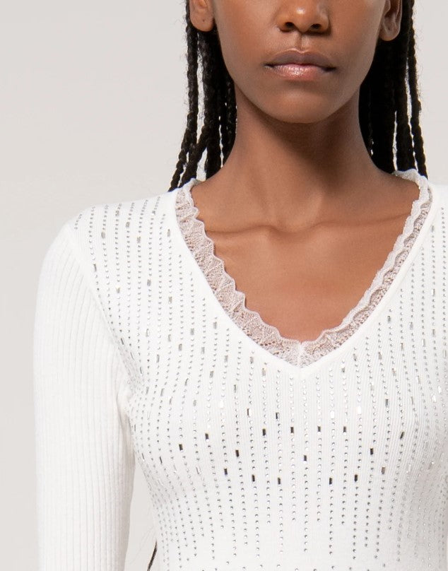 Fracomina FR24WT7009K506R9 slim fit sweater with shiny ribbed rhinestones. V-neck with lace trim and long sleeves.
