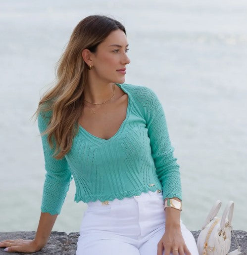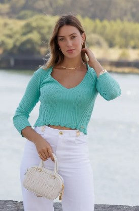 Camisola em malha com decote em V e manga comprida 250226. O fitting da peça é ajustado.
