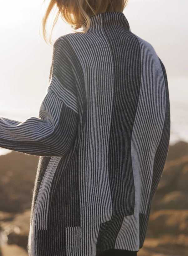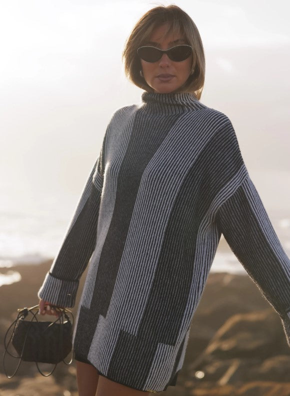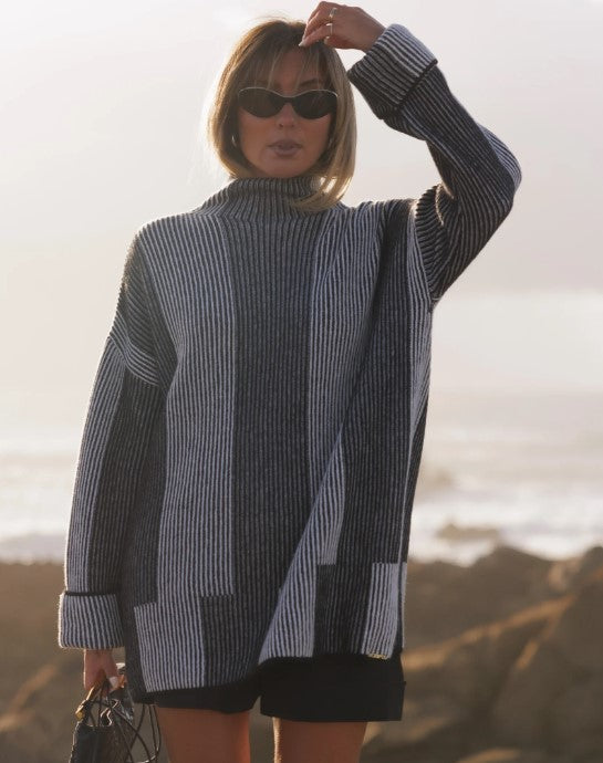 Scripta 245185 sweater, in knit fabric with high collar. Dropped shoulders and long sleeves with pleated effect. Contrasting stripe detail. The fitting of the piece is oversize.