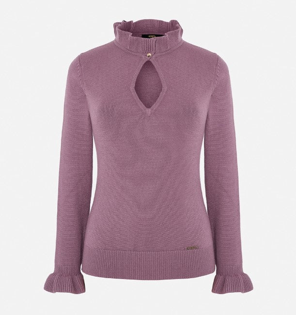 Scripta 245176 long sleeve sweater. Ruffle around the neckline and opening detail, which fastens with a metal button. Long sleeves and ruffle at the bottom. The fitting of the piece is adjusted.