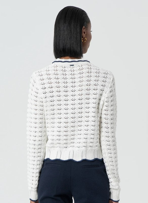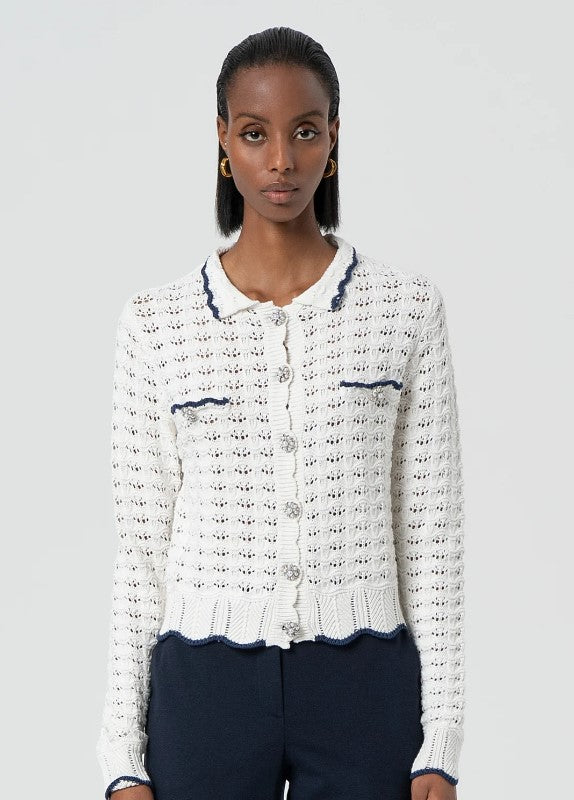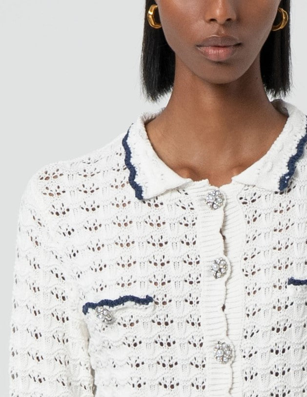 Fracomina F R25ST8022K54301 cardigan, regular fit knit with openwork. Classic cut collar, jewel buttons for opening and long sleeves.