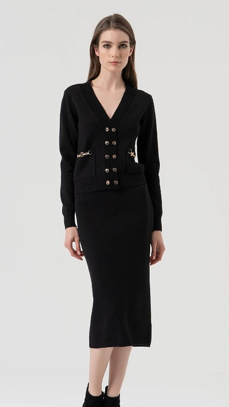 Cardigan de corte regular, abotoamento duplo R25WT8010K55601. Decote em V, botões centrais para abertura, bolsos de aplicação e mangas compridas.