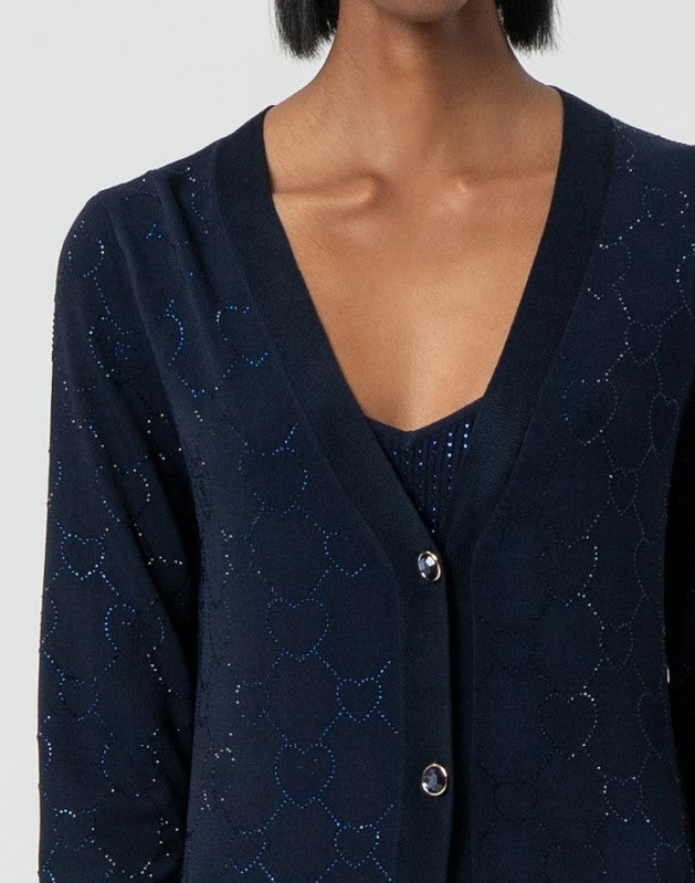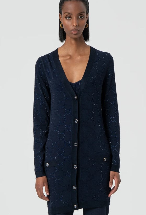 Fracomina F R25ST8006K414R9 cardigan, long regular fit knit with rhinestone monogram. Dropped V-neck, central buttons for opening and long sleeves.