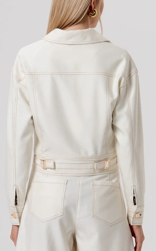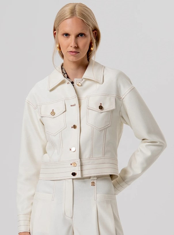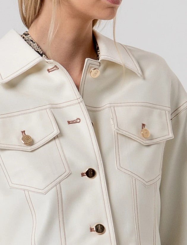 Jaqueta de corte regular com bolsos no peito R26SJ1002W49101. Decote clássico, fechamento frontal com botões e mangas compridas.