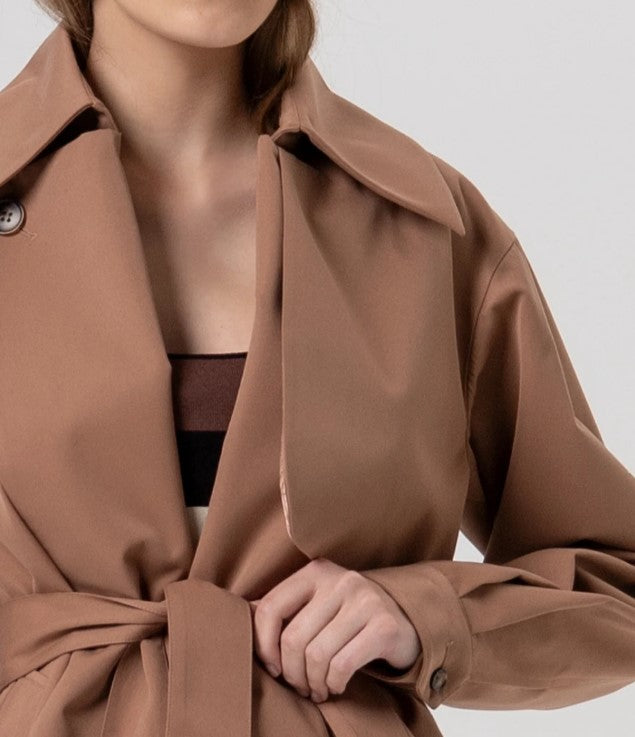 Trench coat overfit confeccionado em tecido técnico R26SC1005W44101. Decote clássico, bolsos laterais, cinto na cintura e mangas compridas.