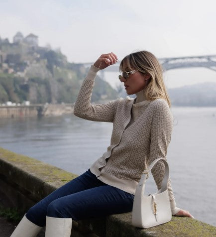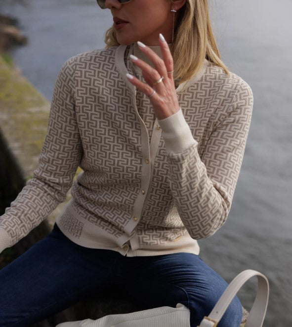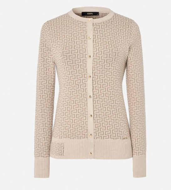 Scripta 245169 knitted coat with round neckline and long sleeves. Fastens with personalized metal buttons. Rectangle detail on the monogrammed belt. The fitting of the piece is adjusted.