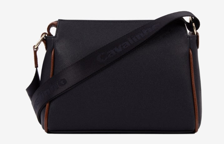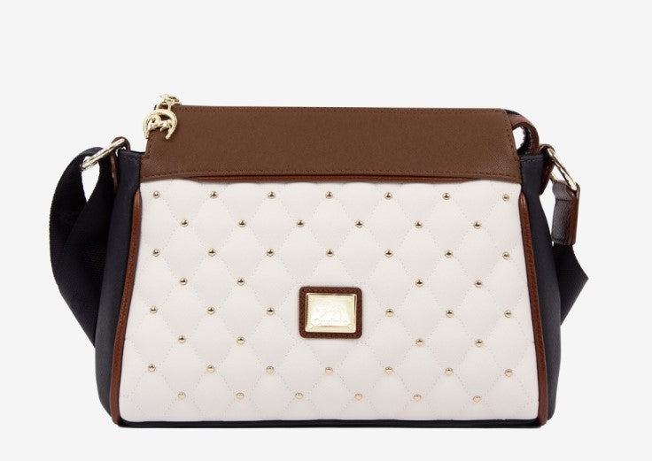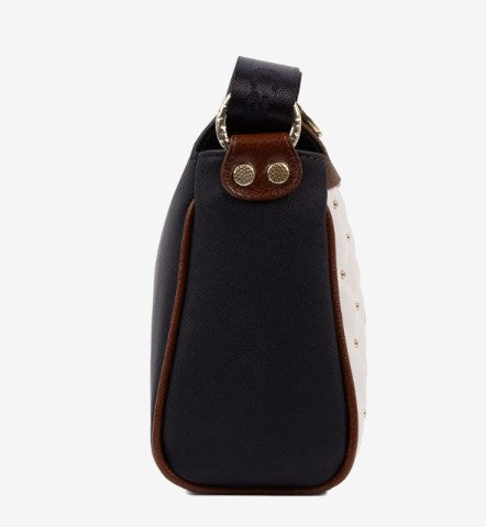 Mala de tiracolo média numa fusão de telas na cor azul, camel e branco 16010344.34.99. Divisória principal com forro em tecido, dois bolsos pequenos e fecho de correr. Alça de tiracolo fixa ajustável em tecido, na cor azul. Detalhes em pele genuína e aplicações douradas.