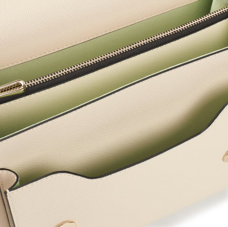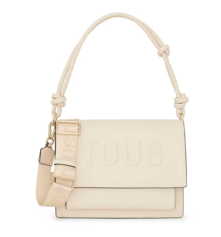 Audree TOUS La Rue New 2001935001 medium crossbody bag in beige faux leather. It features a flap and a fastening with two magnetic buttons. It has two compartments separated by a zipped pocket and an open pocket on the front. Fixed shoulder strap and adjustable and removable crossbody strap. Measurements (height x width x depth): 18 x 25 x 12.5 cm.
