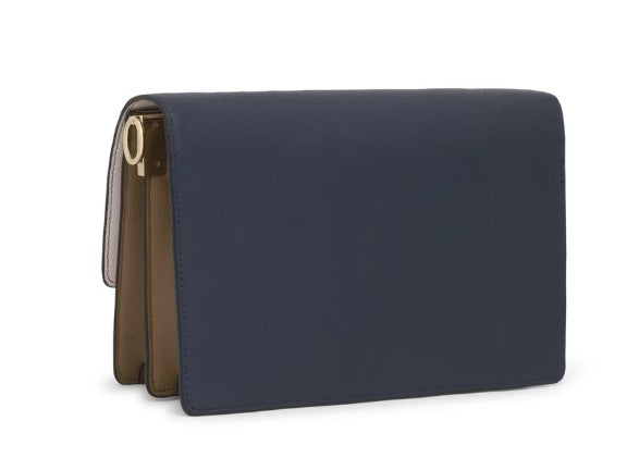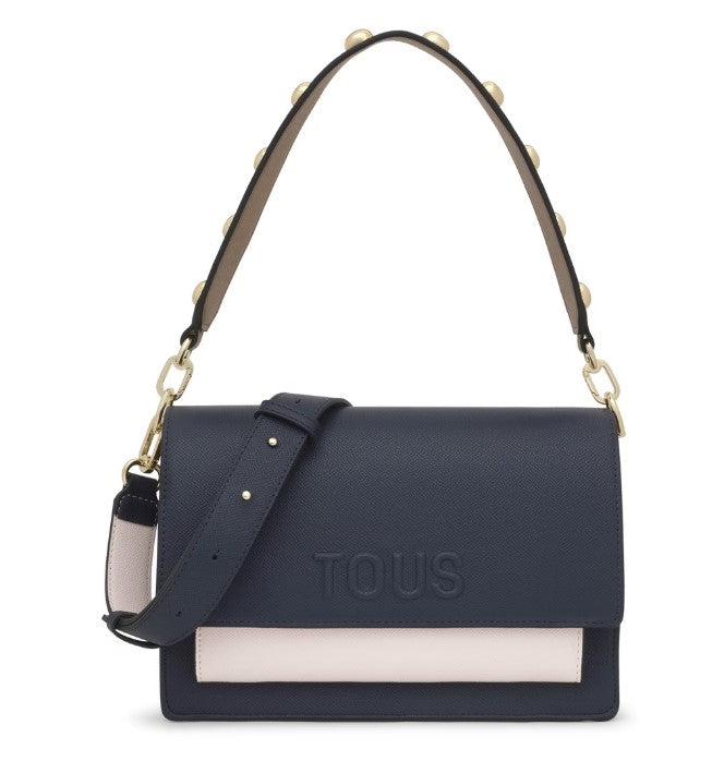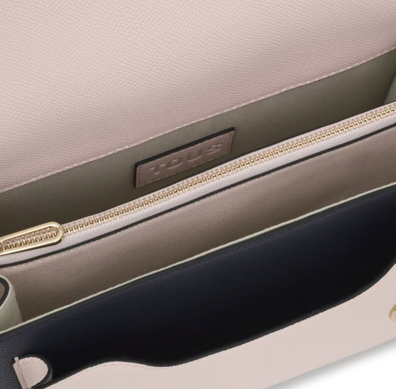 Tous 2002202633 medium Audree Saffiano crossbody bag in blue and pink polyurethane. Flap closure with magnetic button closure. Two compartments separated by another compartment with zip closure and open pocket on the front. Removable shoulder strap and adjustable and removable crossbody strap.