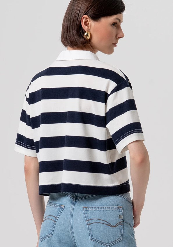 Camisa polo listrada oversized, com gola clássica, botões na frente e mangas curtas R26ST3044J491V9.