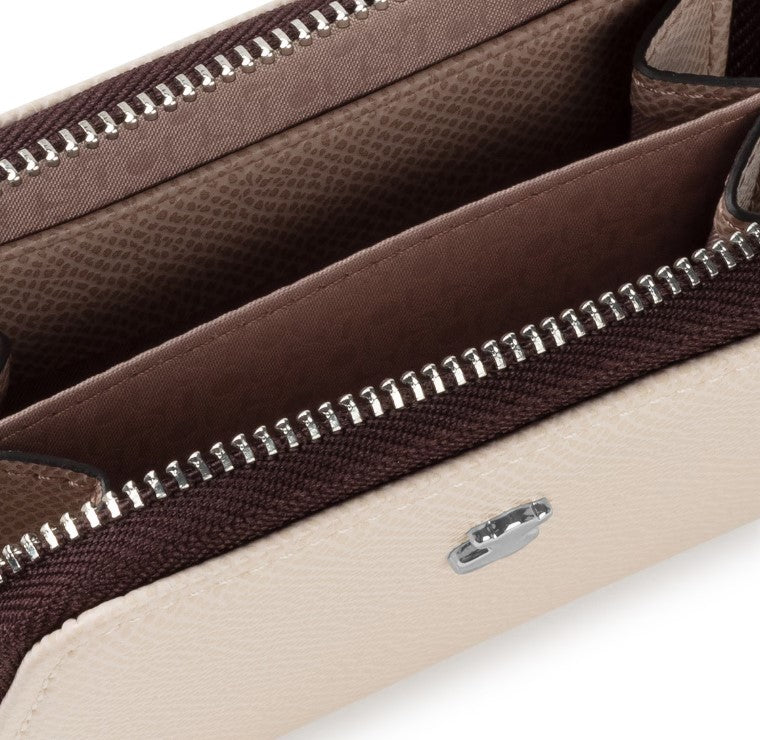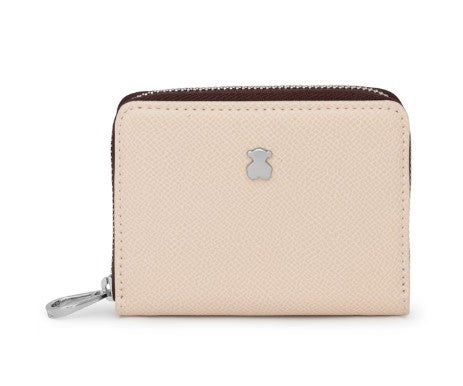 Porta-moedas médio TOUS da coleção New Dubai 2001690001 em poliuretano com efeito saffiano em bege e castanho. Com fecho de correr e duas divisórias para moedas.
