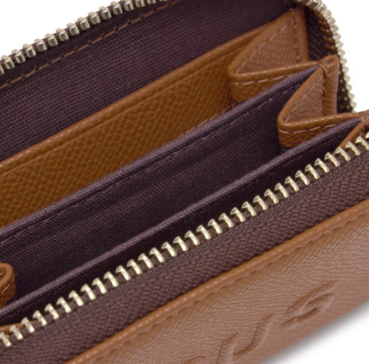 Porta-moedas TOUS Brenda em poliuretano na cor camel 2002106045. No interior tem três divisórias abertas para moedas e duas ranhuras para cartões. Fecho de correr.