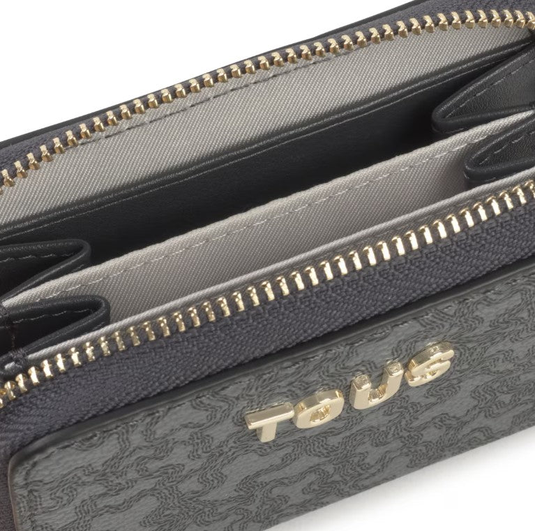 Porta-moedas Kaos Mini Lines 2002184148 em lona com detalhes de poliuretano na cor cinzento-escura. No interior tem três divisórias abertas para moedas e duas ranhuras para cartões. Ranhura exterior para cartões na parte posterior. Fecho de correr.