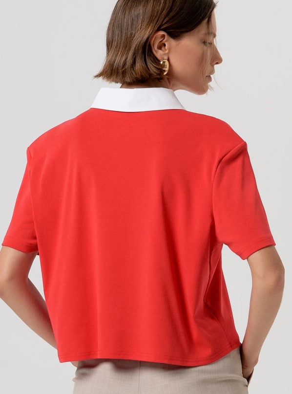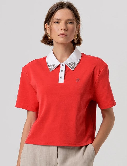 Polo cropped de mangas curtas R26ST3038J40801. Decote clássico com aplicações brilhantes e botões na frente.