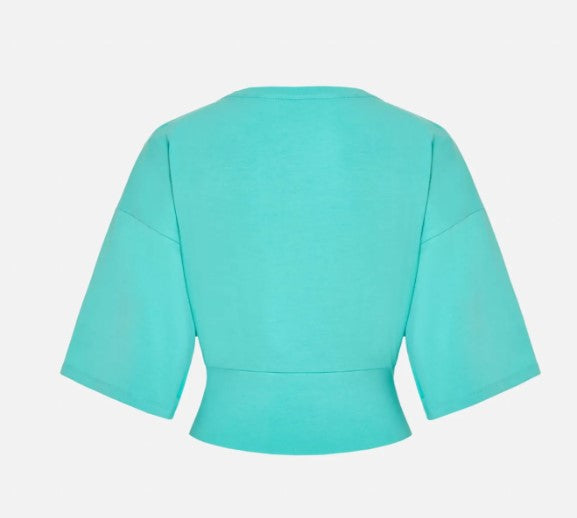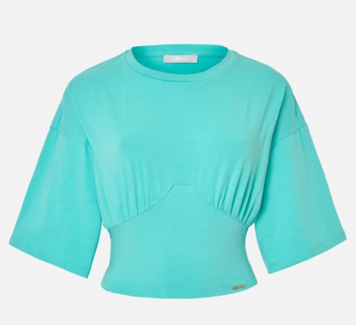 Top 250144 com detalhe de cortes efeito copa e manga curta. Possuí um franzido no corte do peito para um efeito mais ajustado. Fitting ajustado
