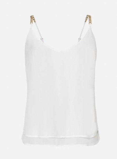 Top 250089 liso com detalhe de alças ajustáveis em corrente. Decote em V na frente. O fitting da peça é fluído.