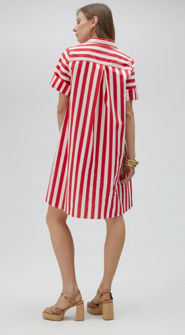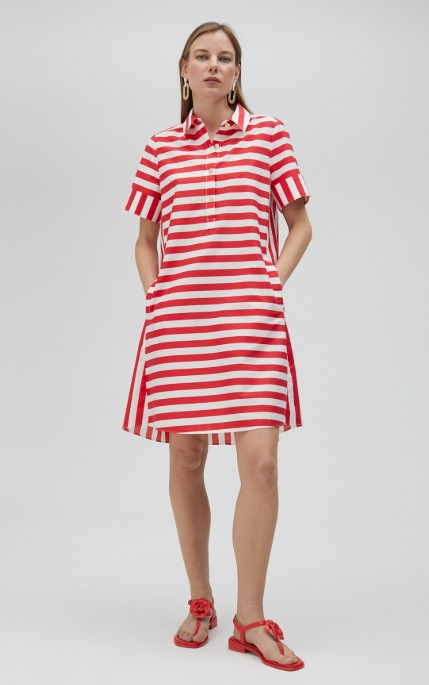 Vestido Lola Casademunt LS2516022 curto fluido com riscas brancas e vermelhas, bolsos laterais e botões dourados com logótipo.