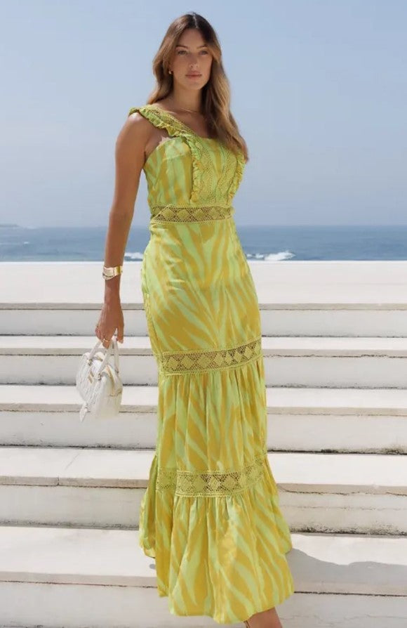 Vestido 250085 estampado comprido. Alças em renda. Pormenor de encaixe no fundo franzido que cria um efeito de folho que traz movimento à peça. Detalhe de encaixes de renda ao longo do vestido. O fitting é justo.