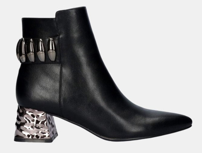 Botim de salto P987-H2216, eleve o seu estilo com estes botins pretos com enfeites cor de estanho, concebidos para adicionar um toque de distinção aos seus looks. O preto profundo acompanha tudo, enquanto os detalhes de estanho adicionam um ar moderno e elegante que não passará despercebido.