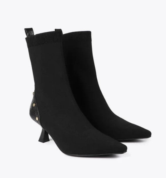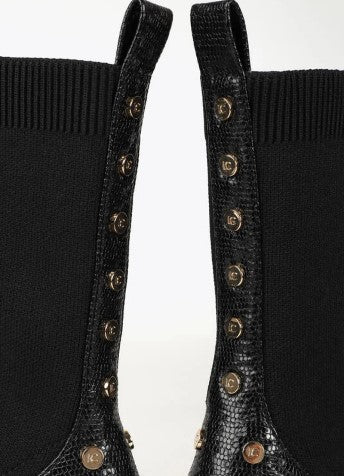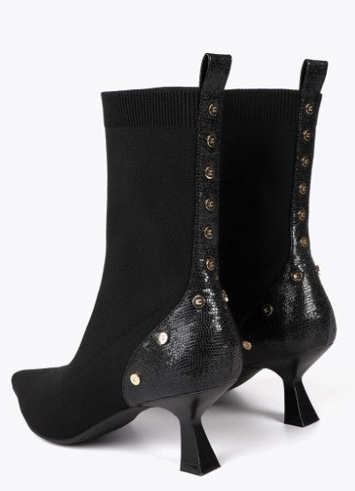 Bota moderna estilo meia feita de tecido elástico LF2505017. Ponta afilada e detalhe de cobra no calcanhar. Salto médio para um visual sofisticado.