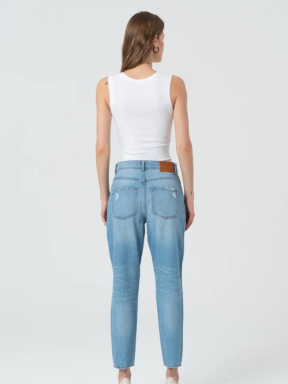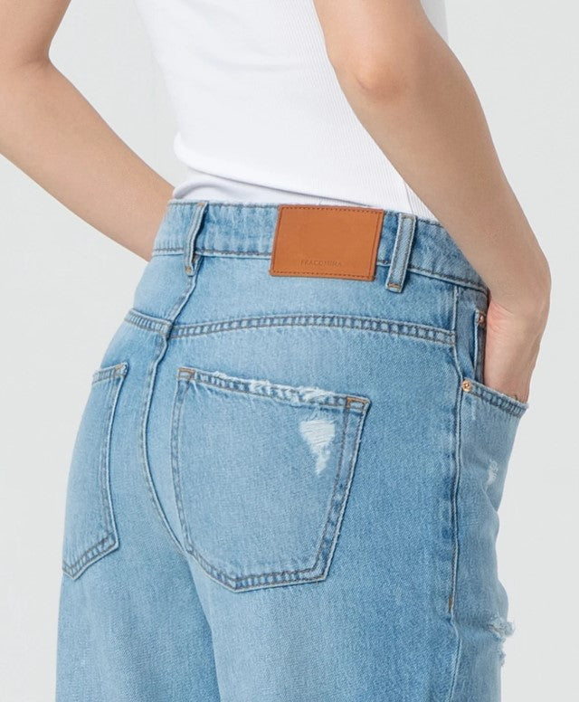 Calça Fracomina FP25SVD005D419R4, jeans cenoura mom fit confeccionada em denim com lavagem clara. Cintura alta, 5 bolsos, rasgos na frente e parte inferior reta.