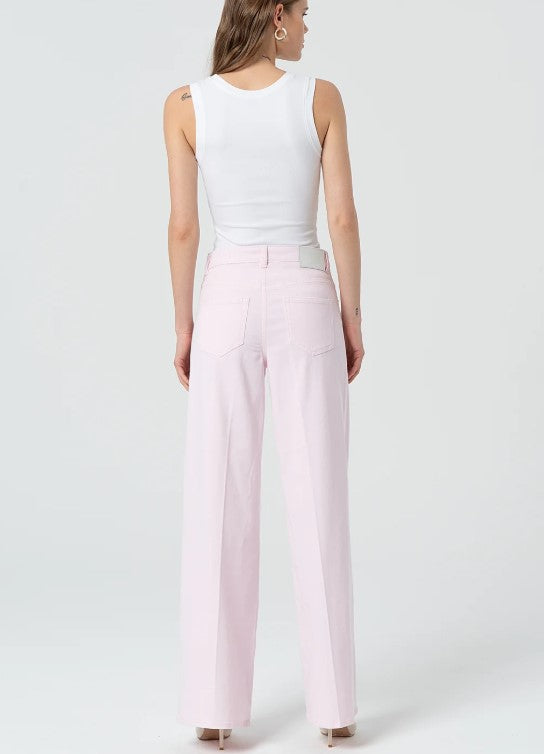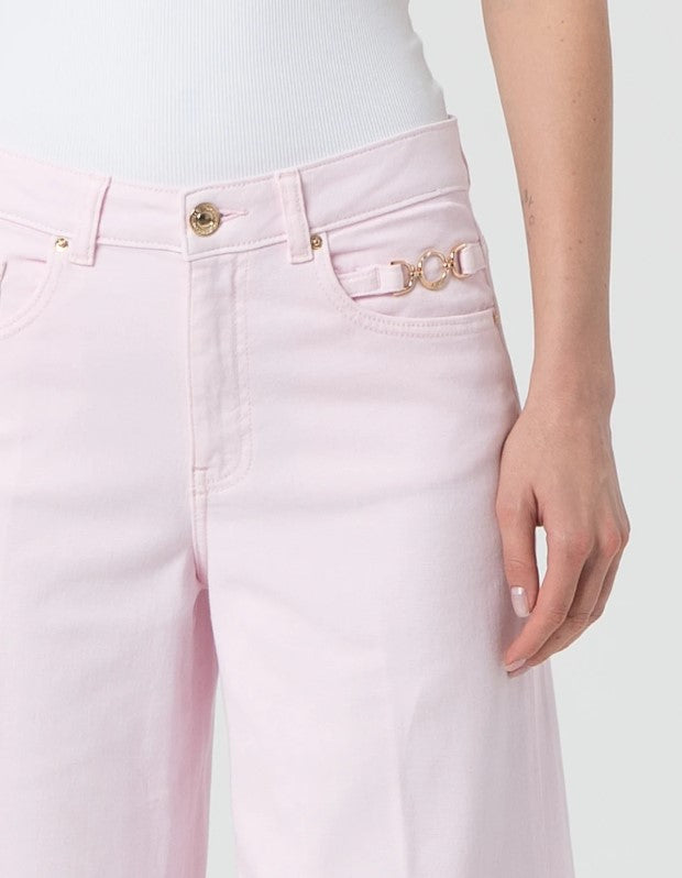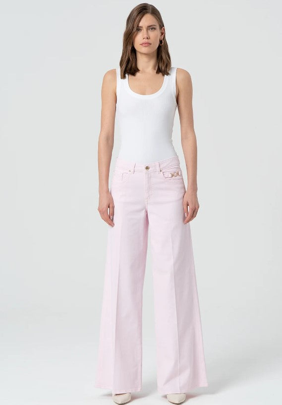 Calça Fracomina FP25SV3015W77001, perna waide confeccionada em touro. Cintura alta, 5 bolsos e parte inferior da perna larga.