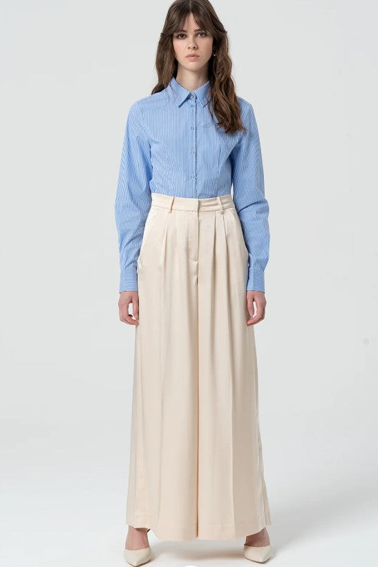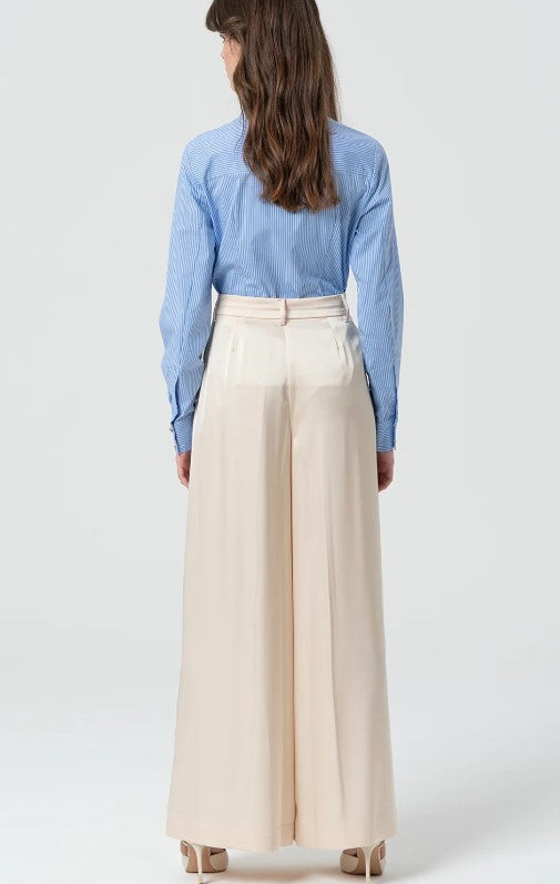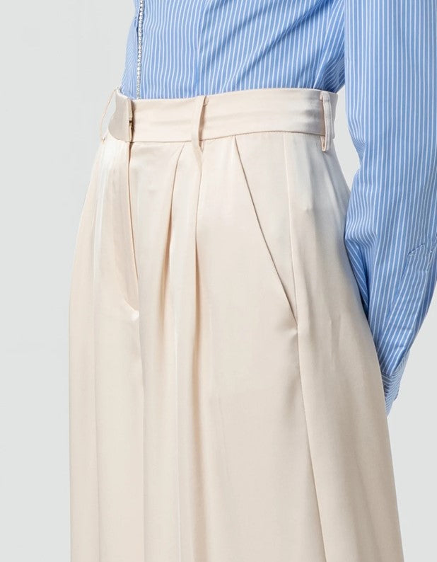 Calça Fracomina FR25SV3002W41101, palazzo confeccionada em cetim. Cintura regular, pinças, bolsos franceses e perna larga.