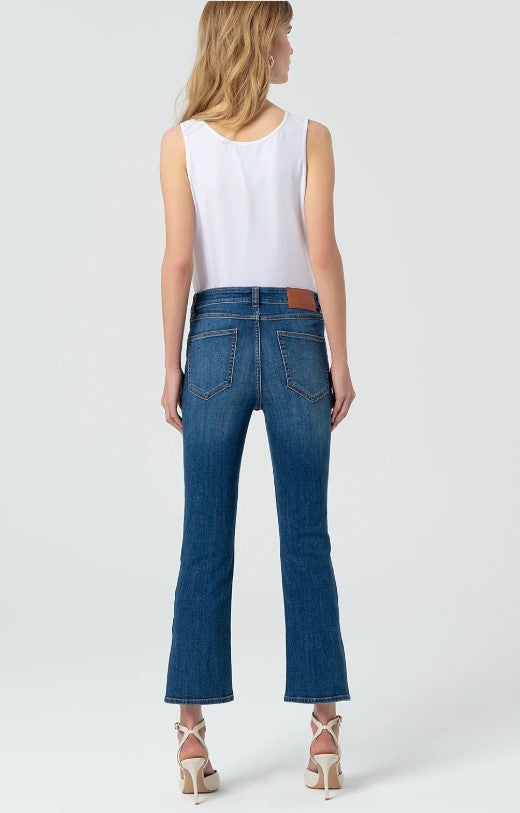 Calça jeans cropped bootcut com efeito push-up FP25SV9005D46093, confeccionada em jeans com lavagem escura. Cintura regular, 5 bolsos, perna e barra slim com fendas.
