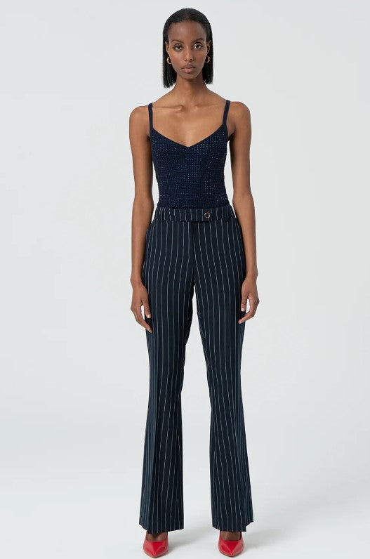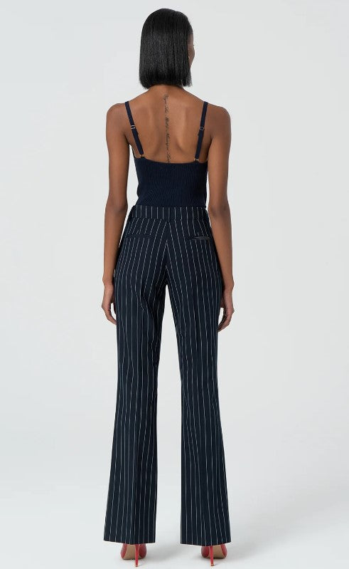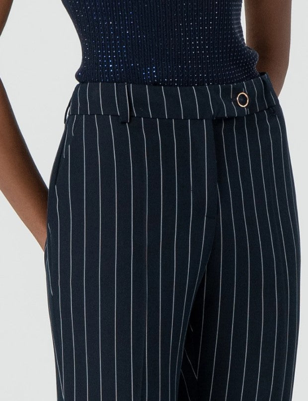 Calça bootcut confeccionada em tecido risca de giz FR25SVA004W761D4. Cintura regular, bolsos franceses, bolsos de debrum nas costas, perna justa com barra larga.