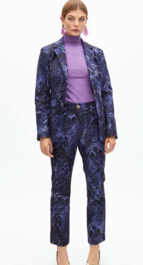 Calças de fato com design animal print em tons de azul LF2514010. Confeccionadas em tecido macio e durável, oferecem um ajuste elegante e confortável. Detalhe de bolsos laterais e fecho com botão metálico. Ideal para um estilo distinto.