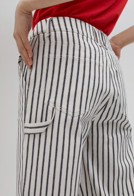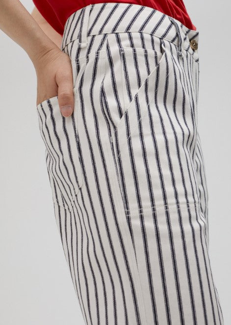 Calças largas com listras azul-marinho, com bolsos laterais e traseiros LS2514023.Detalhes dourados elegantes na cintura. Estilo casual e sofisticado para qualquer ocasião.