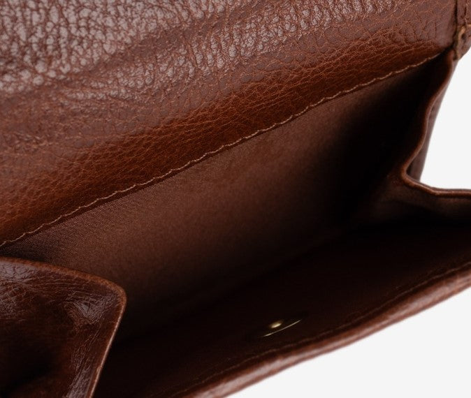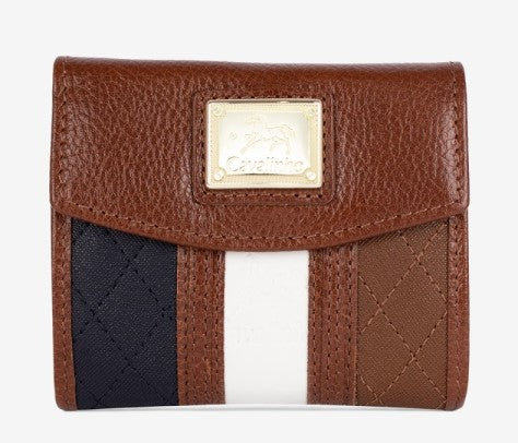 Carteira pequena em tela padronizada à mão com detalhes em pele genuína 26060530.22.99. Uma divisória com fecho de mola, capacidade para nove cartões, uma bolsa transparente e um compartimento para notas; e, uma segunda divisória, livre, para moedas, também com fecho de mola. Aplicações douradas.