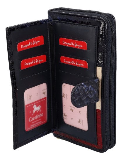 Carteira Cavalinho Honor 28190213.45.99. Inclui alça de mão removível, 20 ranhuras para cartões, 2 micas transparentes, divisões para notas e moedas.