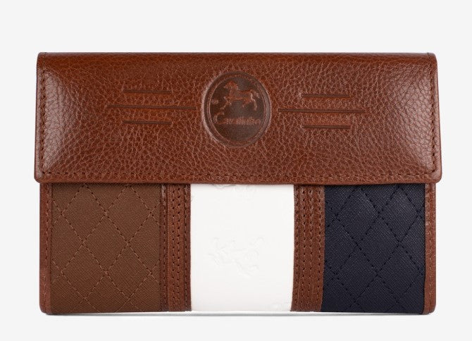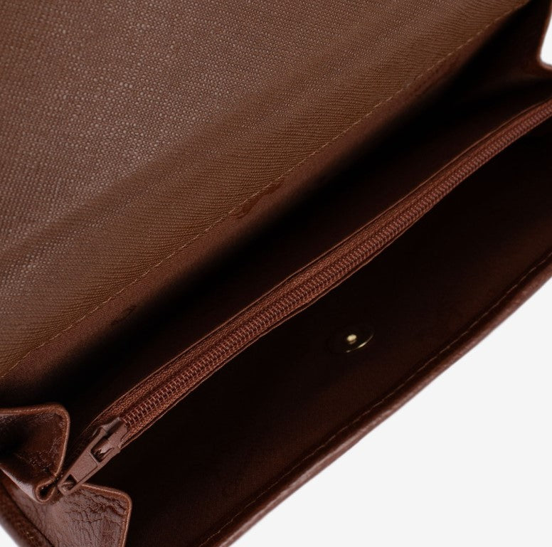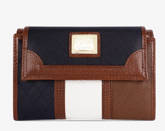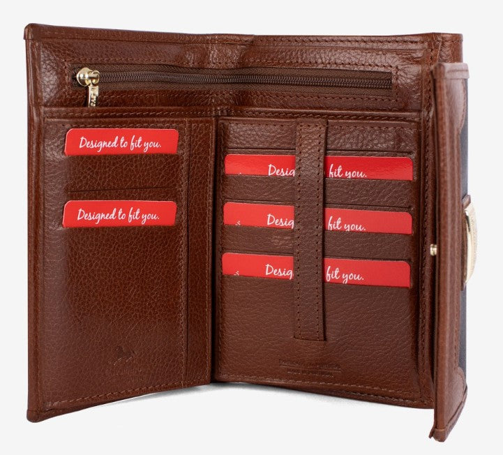 Carteira 26060202.22.99 com duas divisórias principais: na frontal, um compartimento para notas, três bolsas transparentes, um bolso com fecho de correr e três divisões com capacidade total para quinze cartões; na traseira, dois compartimentos livres e um com fecho de correr para moedas.