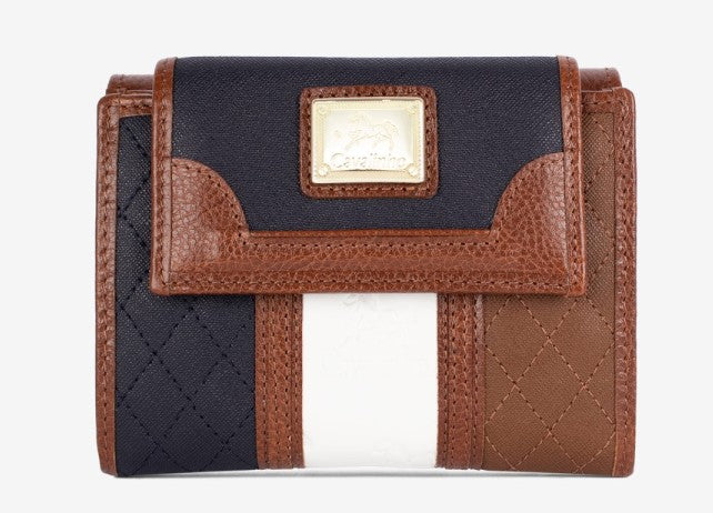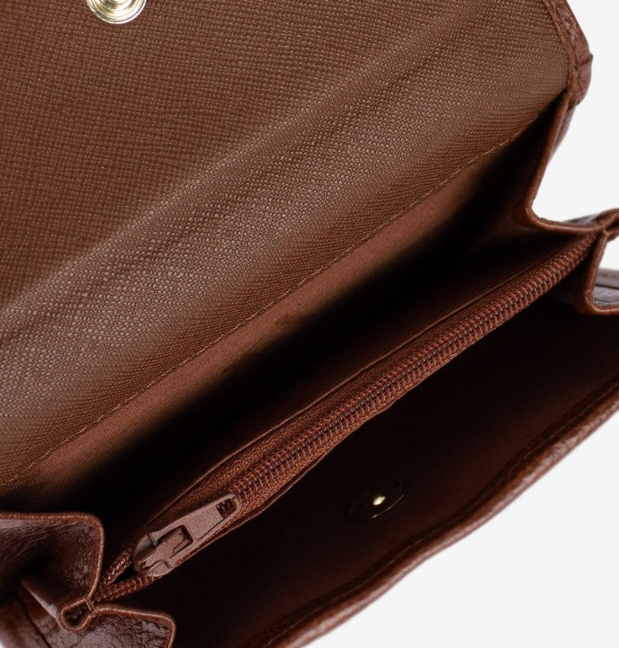 Carteira 26060215.22.99 com duas divisórias: na frontal, dois compartimentos para notas, quatro bolsas transparentes e capacidade para doze cartões; na traseira, dois compartimentos livres e um com fecho de correr para moedas.