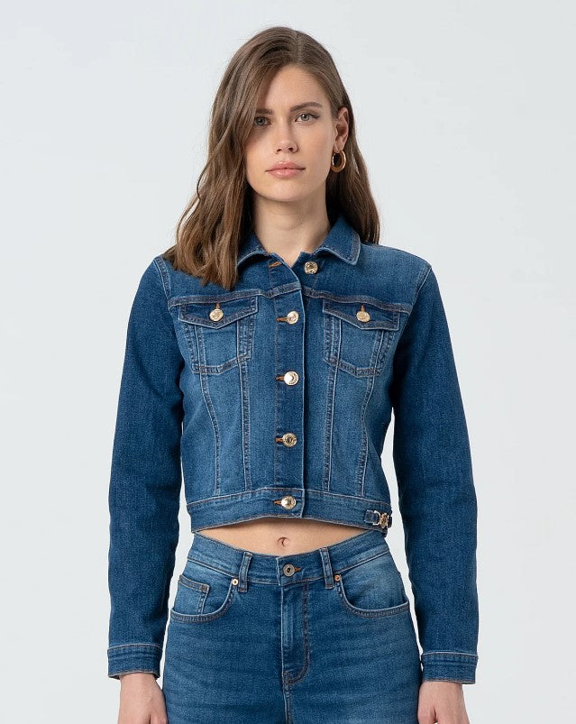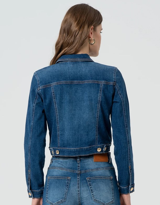 Casaca Fracomina FP25SJ4001D46093 cropped regular fit confeccionada em jeans com lavagem média. Gola gola regular, botões centrais para abertura, bolsos de aplicação e mangas longas.