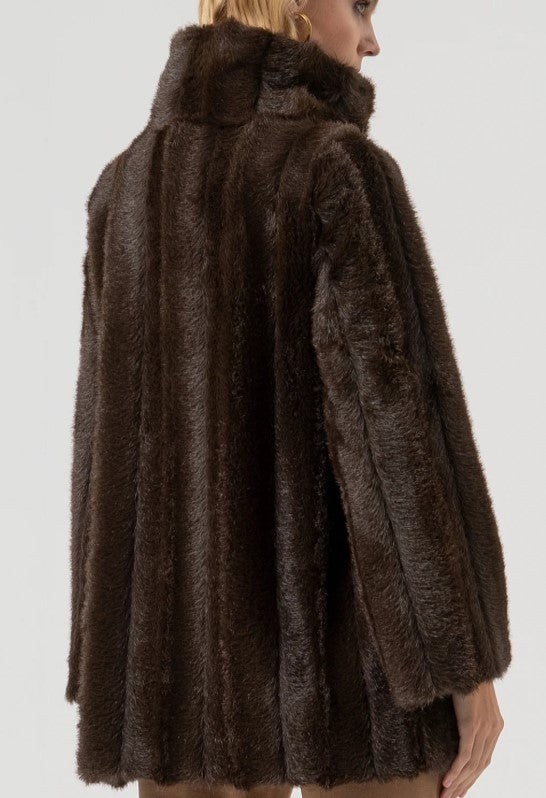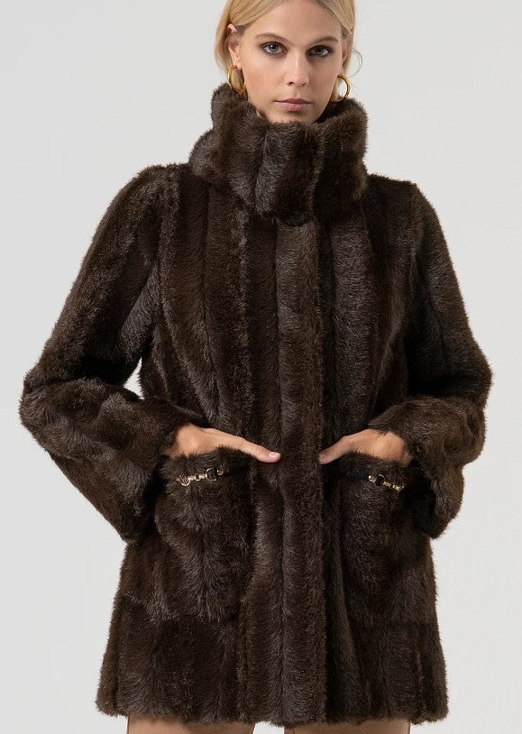 Jaqueta longa com corte solto. Pelo sintético, gola alta, abertura central, bolsos de aplicação com acessório metálico e mangas compridas.