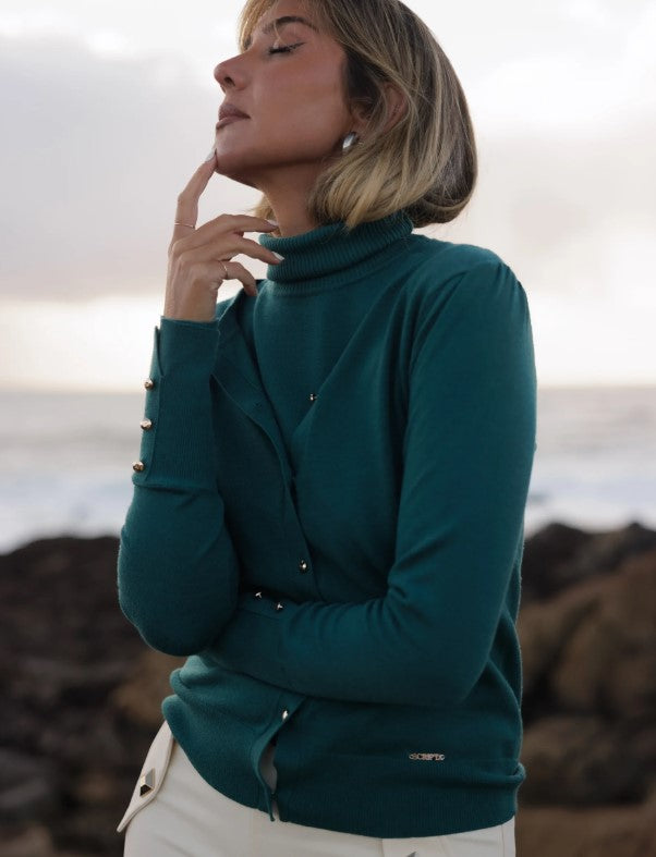 Casaco Scripta 245164, em malha com decote redondo e manga comprida. Aperta com botões metálicos personalizados. Pormenor de pequena abertura na manga e botões metálicos. O fitting da peça é ajustado.