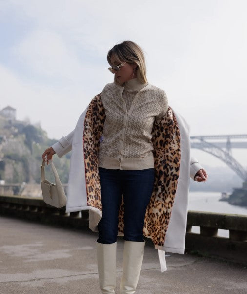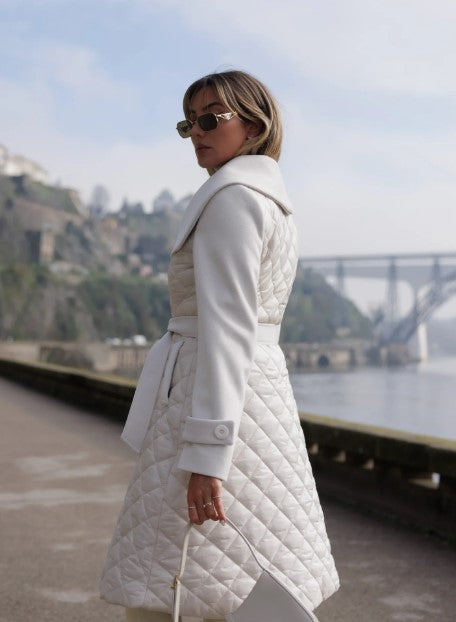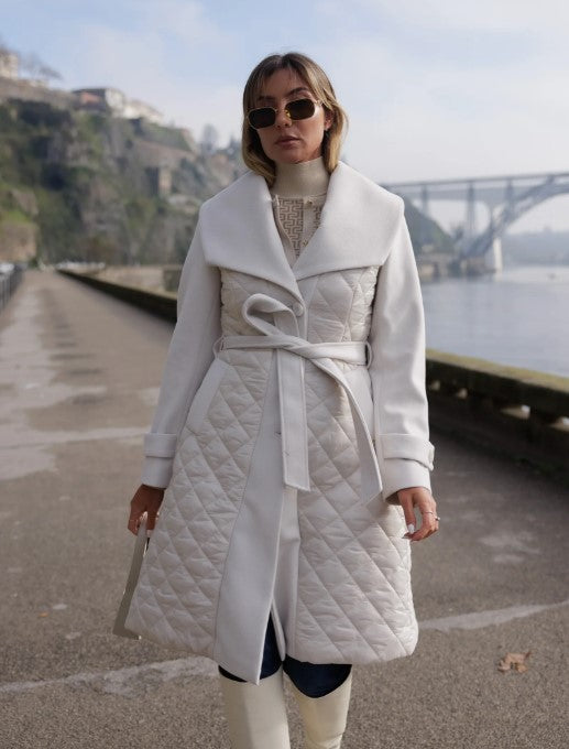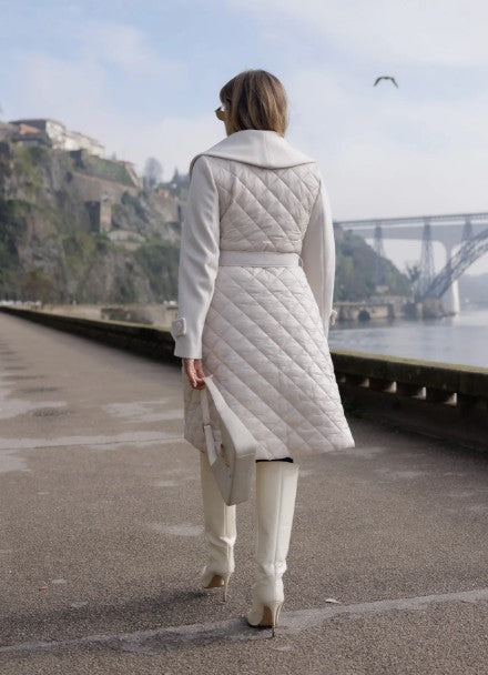 Casaco Scripta 245127, de comprimento médio em artigo liso e acolchoado. Manga comprida e gola de abas largas. Aperta na frente com botões. Detalhe de presilhas no fundo da manga e aperta com cinto ajustável. Fitting da peça com godé no fundo.